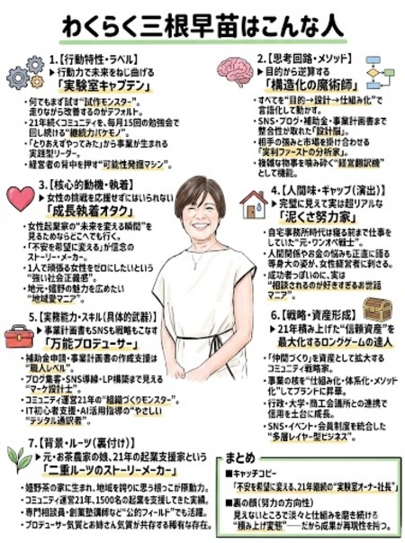 ちなみに、ChatGPTが分析してくれたわくらく三根はこんな人!です。