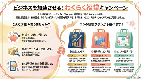 同じようにわくらく福袋のサイトをChatGPTに読み込ませて、情報を整理しながらグラレコ風に作ってみました。
