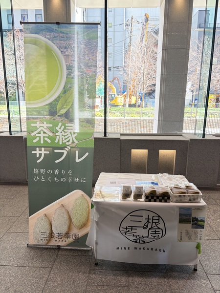 オフィスビルのエントランスにテーブルを並べて、茶縁サブレを販売。