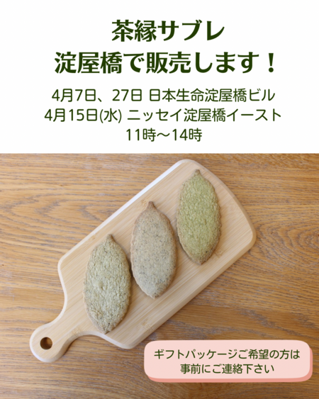 4月も淀屋橋のオフィスビルで、7日、15日、27日に茶縁サブレの販売を行います。
