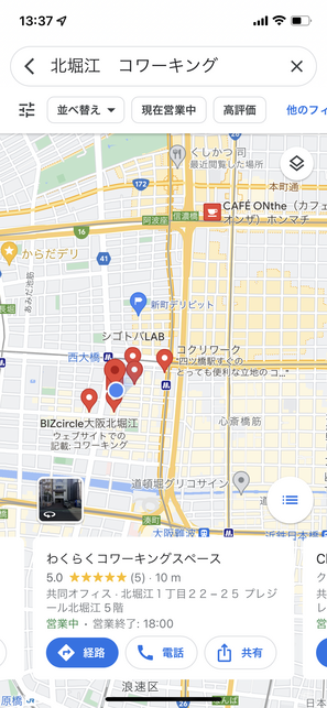 例えば「北堀江 コワーキングスペース」で検索すると次のような画面になります。