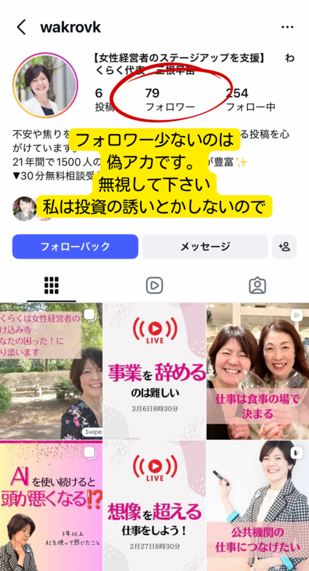 特に、わくらくの会員さんが私の偽アカウントをフォローしていたら、
