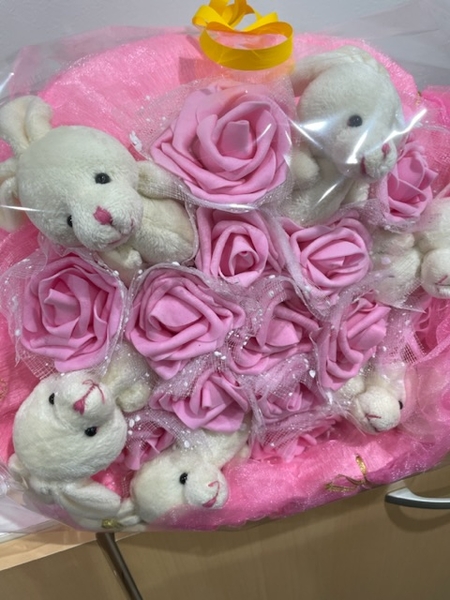 ウサギのぬいぐるみをアレンジした花束、初めてみました!