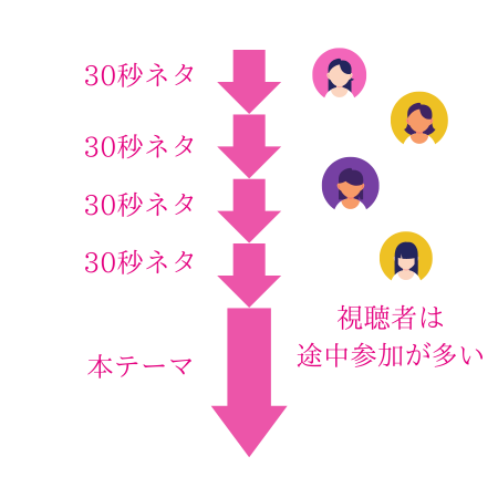 - 視聴者が途中から参加しても話が分かるように