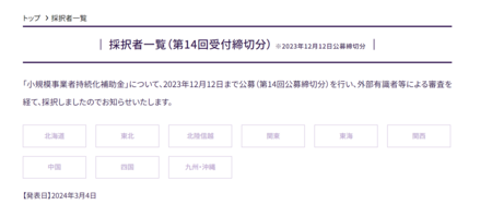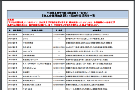 小規模事業者持続化補助金第14回募集の採択者が発表されました。